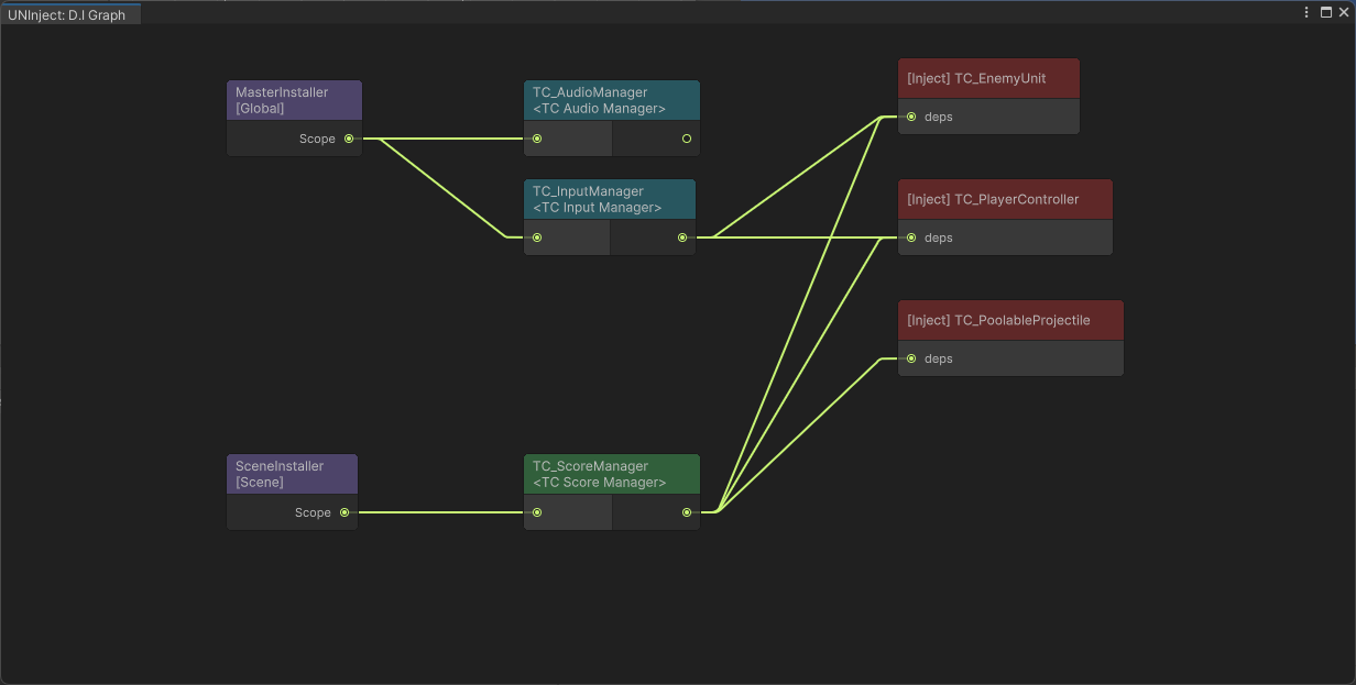 Unity GraphView(Experimental) 기반 에디터 창으로, 현재 에디터 상태에서의 UNInject 구조를 대략적으로 시각화합니다.
