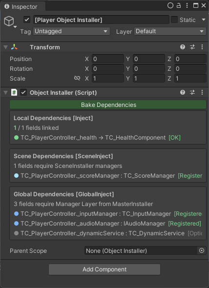 • ObjectInstaller가 있는 프리팹/오브젝트에서 Bake Dependencies 를 눌러 [Inject] 필드가 채워졌는가?