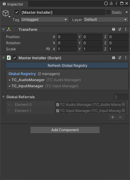 • 인스펙터 컨텍스트 메뉴: Refresh Global Registry (MasterInstaller.RefreshRegistry()).