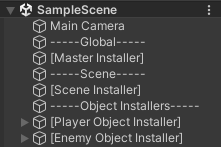 배치 : 씬 루트 근처에 GameObject를 만들고 SceneInstaller를 추가합니다. 예: [Scene Installer].