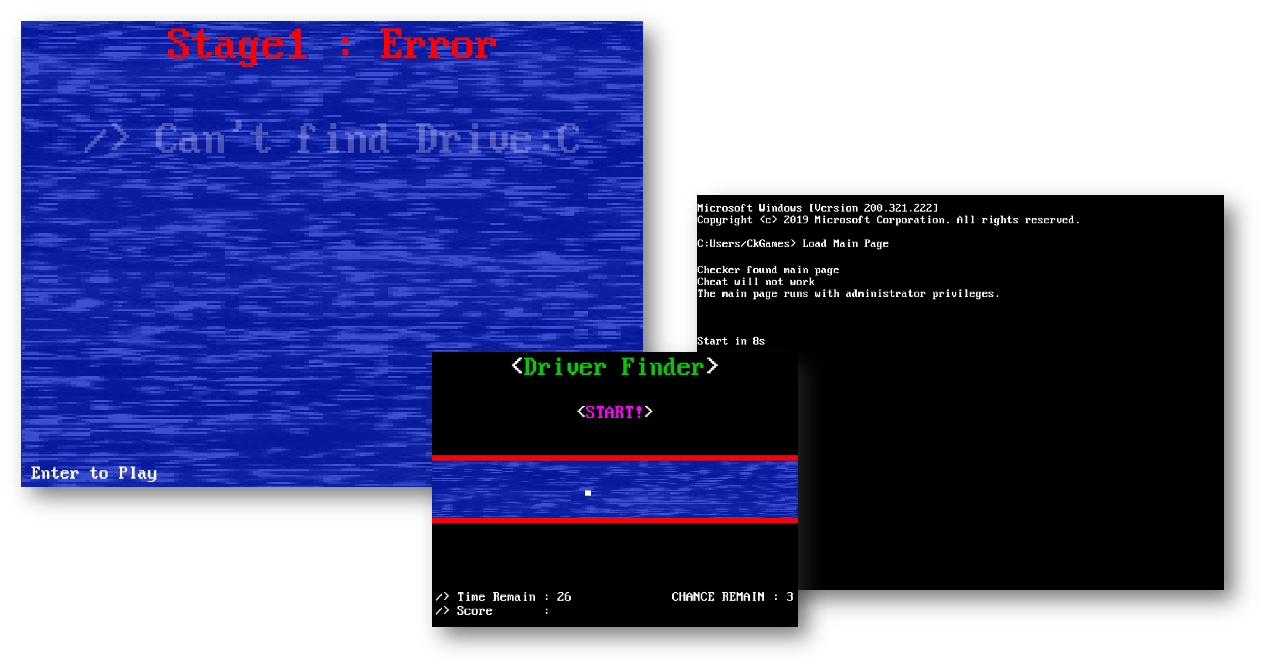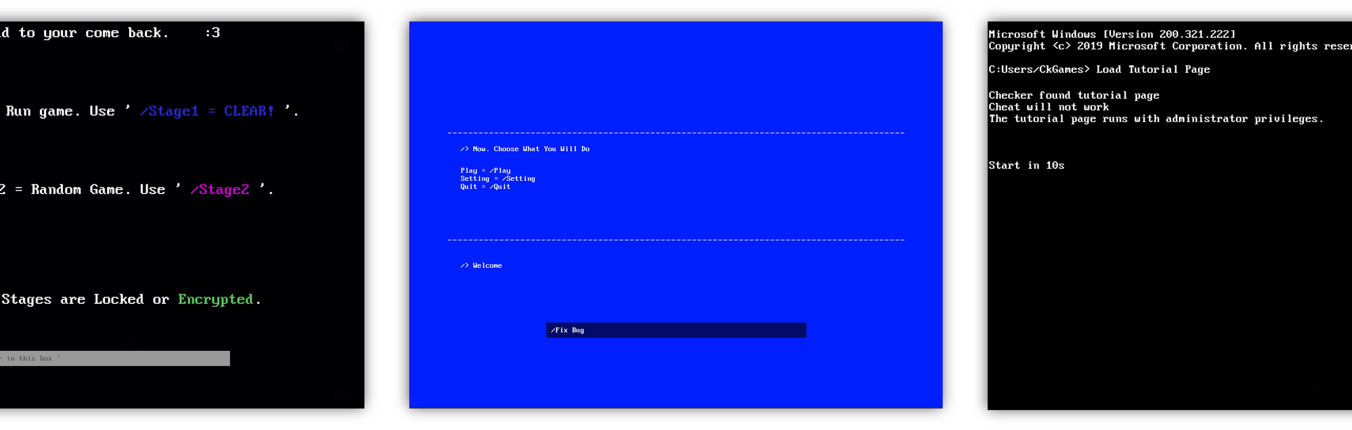 버튼이 아닌 커맨드를 통해 설정 및 각종 스테이지를 로드하거나, 각 스테이지를 클리어 할 때 마다 오류가 하나씩 픽스된다는